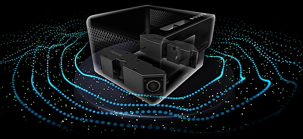 Első látásra szokatlan és egyedi a projektor külleme, mivel a treVolo cég által kifejlesztett, 360 fokban sugárzó, négyhangszórós audiorendszere nagyobb helyet igényelt, mint amit egy hagyományos projektor belseje megenged. Így a különleges treVolo audiorendszer egy külön „dobozt” kapott, amelyet a projektor alatt, de azzal egybeépítve helyeztek el a fejlesztők. Ezt szemlélteti az alábbi ábra: