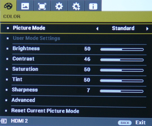 A Color almenü tartalmazza talán a legfontosabb beállításokat a felhasználó számára, különösen akkor, ha kalibrálásra szánja el magát. A képi mód (Picture Mode) pontban választhatunk néhány gyári preset (Bright, Standard, Movie, Football, az EcoPro lámpaüzemmód beállításakor az EcoPro) és a két egyéni beállítás (User1, User2) közül, továbbá az Advanced pontban a gamma, a fehéregyensúly és a színkezelés mellett a képet módosíthatjuk MoviePro és az ISF speciális módok kiválasztásával (ez utóbbiakhoz csak az ISF-minősítésű kalibrátorok férnek hozzá). A HDR jelet a metaadatok alapján a projektor felismeri, ilyenkor a Picture Mode-ban kiszürkítve megjelenik a HDR üzemmód, és néhány paraméter hozzáférhetősége megszűnik.