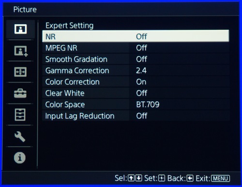 Mint látjuk, rengeteg jellemző állítható, amit ki is fogunk használni majd a kalibrálás során. A legalsó menüpontban (Expert Settings) további lehetőségeket találunk, amelyek közül néhányat kikapcsolunk, mások pedig közvetlenül a kalibráláshoz kellenek (Gamma Correction, Color Correction, Color Space). A gamerek is találnak itt egy hasznos menüpontot (Input Lag Reduction), a projektor késleltetésének (a bemeneti jel és a kép megjelenése közötti késleltetés) csökkentésére.