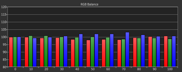 Az RGB együttfutás (fehéregyensúly) a teljes tartományban. Látható hogy kalibráció előtt 30 és 60% között több a kék és kevesebb a vörös, mint kellene, a zöld pedig egyenetlen. A kékből kalibráció után is maradt még egy kis többlet, de az átlagos színhőmérséklet, de az átlagos színhőmérséklet 6558 K, és nincs zöld elszíneződés