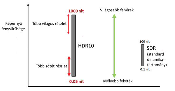 Egy másik – jelenleg a leginkább elfogadott – HDR formátum a HDR10, amely sokkal megengedőbb a dinamikatartományt illetően. Mint a következő ábránkon látható, a megkívánt dinamika (minimum) 20.000:1, 1000 nit csúcsfehérrel és 0,01 nit feketével. Emellett az is fontos, hogy a sötét tartományban és a világos tartományban is több részlet jelenhessen meg. Ennek feltétele a 10-bites színenkénti kvantálás az eddigi 8 bit helyett.