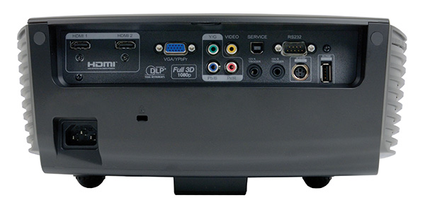 Lássunk most néhányat a fontosabb jellemzők közül: 500.000:1 dinamikus kontrasztarány, 1000 ANSI lumen fényerő, 23 dB zajszint (Eco módban), 7 kg tömeg. A csatlakozók között találunk 2 db HDMI, egy VGA, egy külön komponens videó (3 RCA) és kompozit videó bemenetet. 2 db +12 V-os triggerkimenet is van pl. a vászonmozgatás vagy a világítás vezérléséhez, és egy 3D szinkronjel-kimenet a 3D RF rendszer számára, hiszen az Optoma új projektora 3D Full HD vetítésre alkalmas. Nem hiányzik a hátlapról az RS232 vezérlőport sem, és van rajta egy USB(B) – szervizport – és egy USB(A) – 5 V/6 W táplálást kiadó – csatlakozó is.